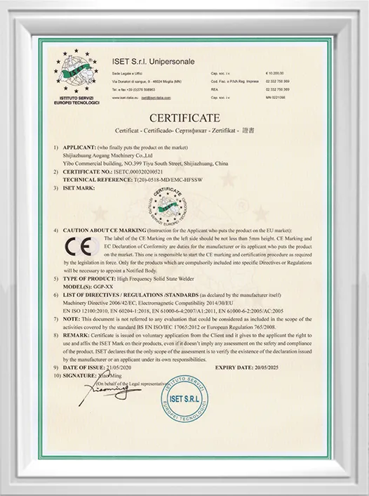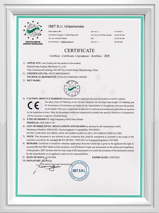 Компания Aogang, стремящаяся к технологическим инновациям, владеет более чем 20 патентами, а наши продукты соответствуют Сертификаты CE, SGS.